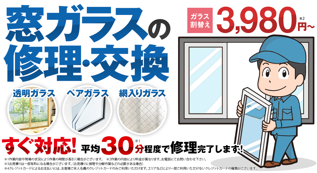 ガラスのトラブルは、いつ、どこで起こるかわかりません。模様替えを行っている時に家具をガラスにぶつけガラスが割れてしまう。子供がボールをガラスに当て割れてしまう。台風や突風被害などでガラスが割れてしまう。といったことが起きてしまいます。そのような場合、すぐにガラス修理を依頼したいものの手元にお金がないので依頼することができないといったことを防ぐため、現金払いだけではなくクレジットカード払いにも対応しています。携帯端末を持参しお客様のもとに伺うことで、その場でクレジットカード決済が可能。現金不要でガラス修理をして頂くことができます。 また、法人様の場合は請求書払いも可能です。オフィスなどの窓ガラスが割れてしまった場合などでも請求書払いですぐに対応が可能です。申し訳ございませんが、請求書払いは法人様のみとさせて頂いております。