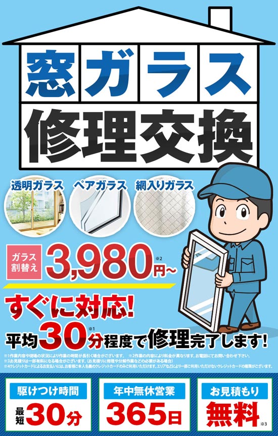 相場と比べてあまりにも安すぎる見積もりにはご注意ください。「格安」や「激安」はお客様にとっては魅力的ですが、受付対応時のトークにはお気を付けてください。ガラス修理で2,980円~などと提示して、実際に請求される料金は相場よりも高額になるケースもございます。電話で問い合わせの際に、「総額はいくら?」と料金の上限を確認しておくことをお勧めいたします。